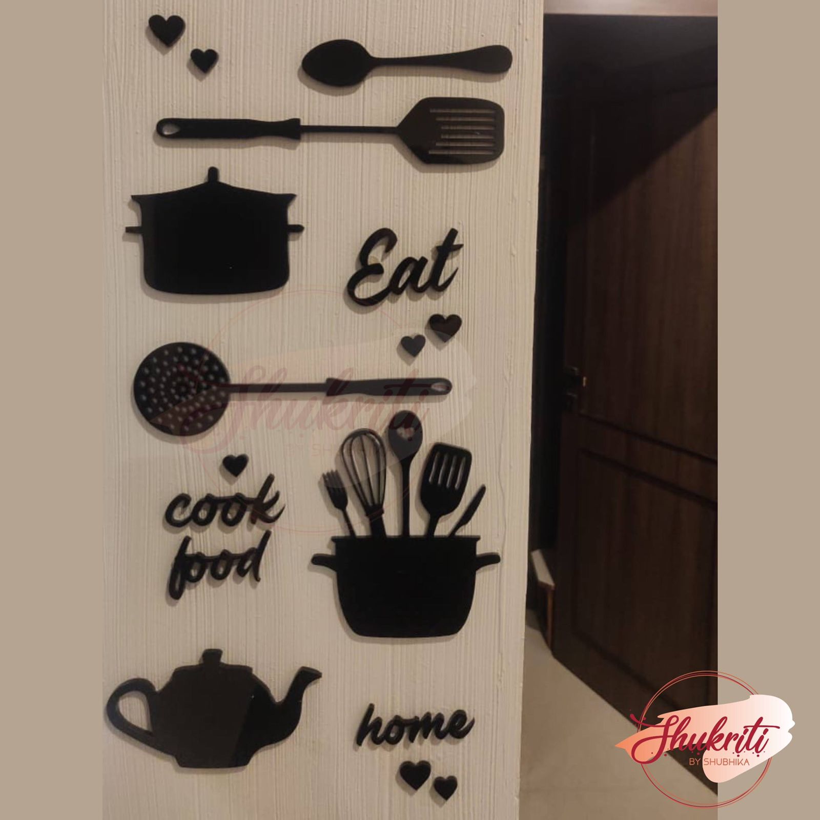 COOK-LOOK BY SHUKRITI is a 10-piece set of acrylic kitchen wall décor. With each part of a different shape and size, the set ensures a decoration piece for every wall and nook of your kitchen, leaving no space uncovered.