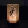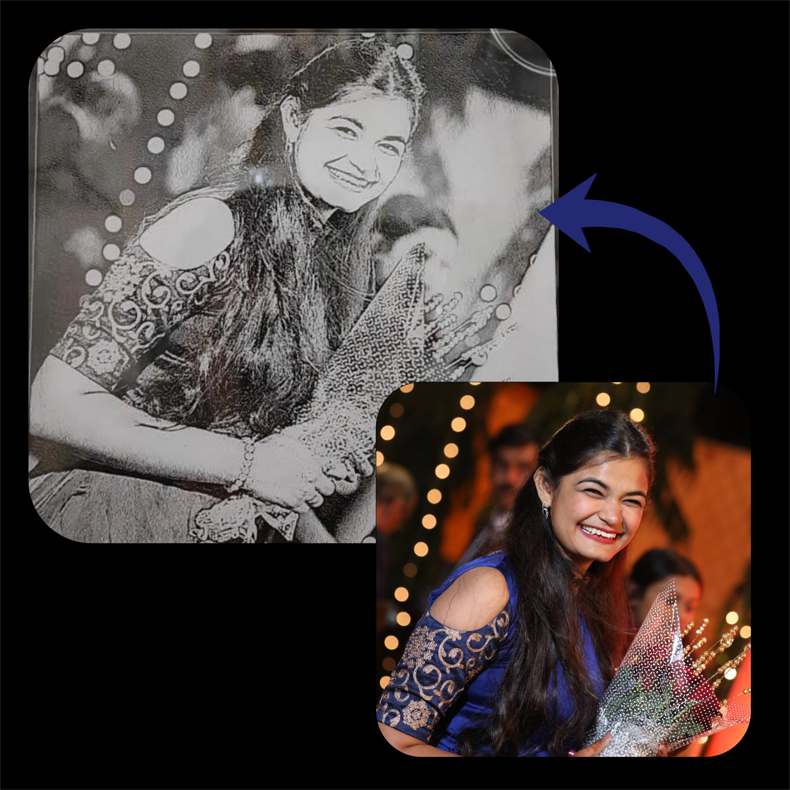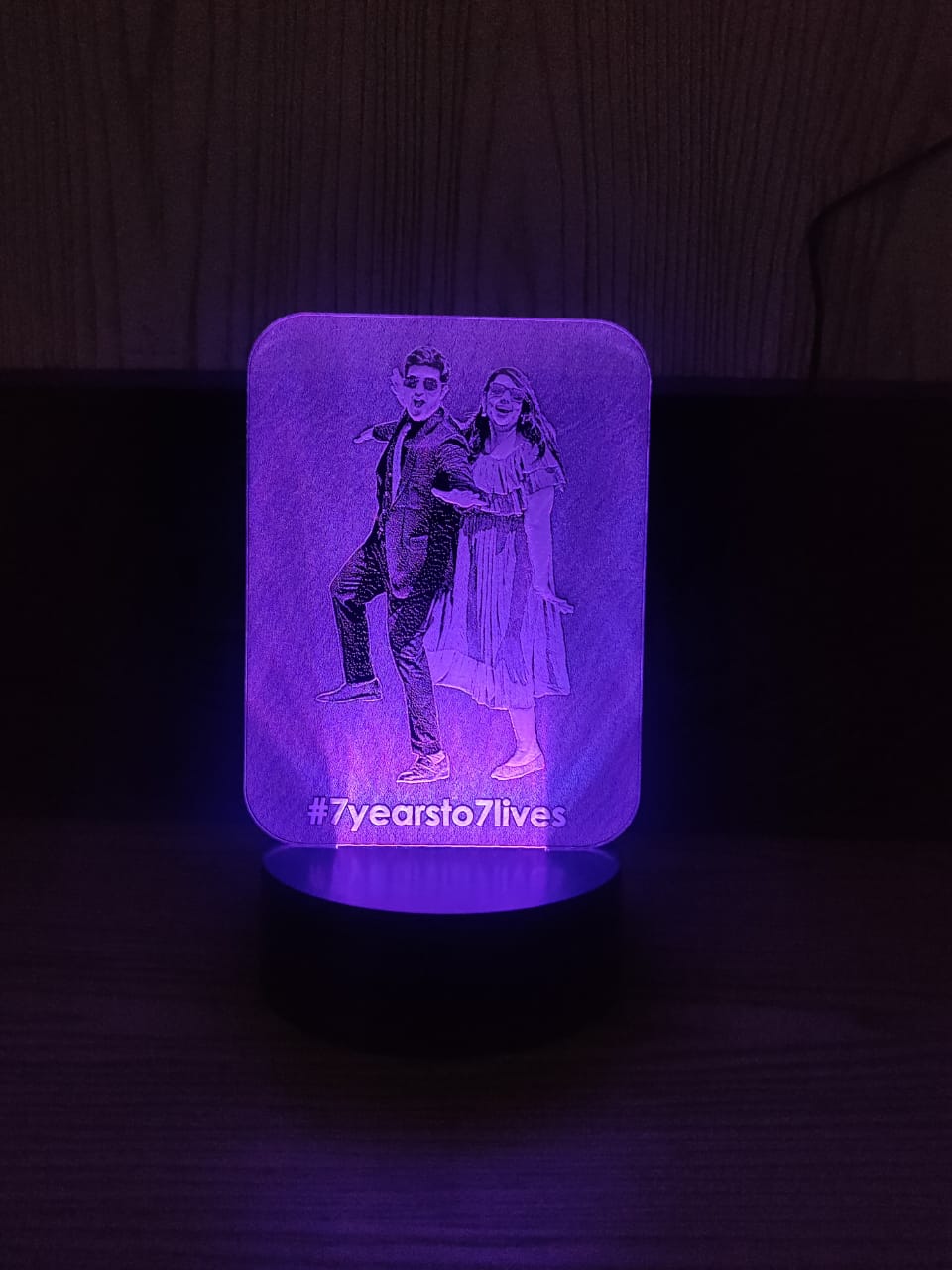 Made in an 8” by 5” clear acrylic frame, LUMIÈRES BY SHUKRITI is a light-up lamp that can be placed on flat surfaces. Pictures and/or a few words, as per desire, can be engraved in the acrylic. The piece comes with LED lights below the acrylic frame, that can be changed with a remote included with the piece.